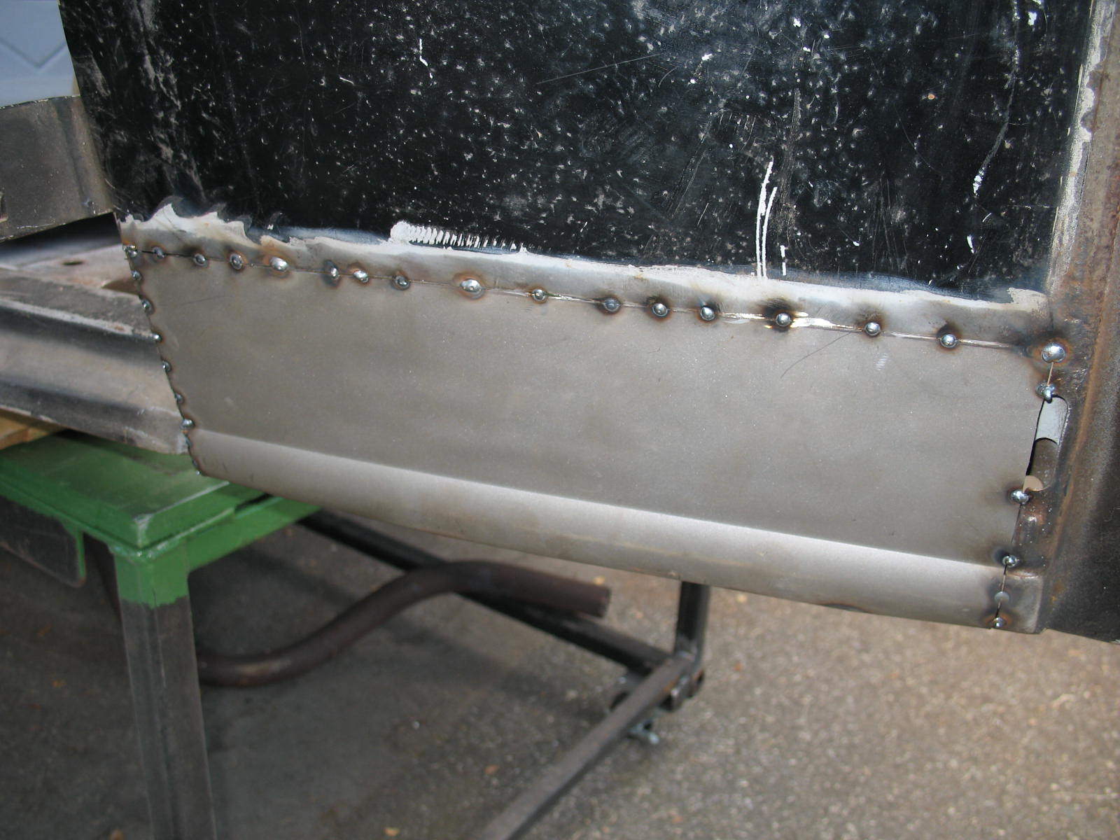 After we got all the rivets in, the new bottoms of the quarter panels had to be crimped over the subrails and welded in place. Walt let me borrow his spotwelder which worked like a champ. Since the Roadster chassis is now running, I've had so many requests for rides that today I added an extra seat for any brave soul that wants a ride!